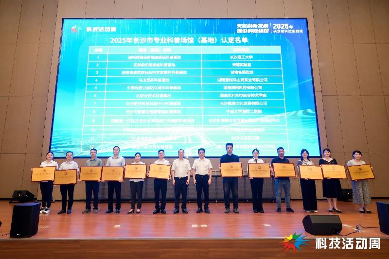 5月27日,2025年长沙市科技活动周启动仪式在岳麓山实验室举行,中国工程院院士柏连阳、单杨,湖南省科技厅副厅长钱国平,副市长彭涛出席。现场为水安全技术科普基地等12家2025年新认定的市专业科普场馆(基地)授牌,我校成功认定为水安全技术长沙市专业科普场馆(基地),党委委员、副校长蒋买勇及科研处相关负责人参加仪式。