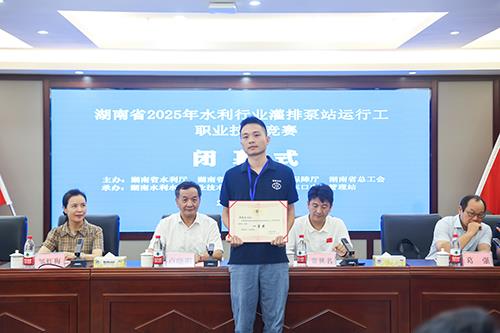 7月23日上午,由湖南省水利厅、湖南省人力资源和社会保障厅、湖南省总工会联合主办,湖南水利水电职业技术学院、益阳市大东口电排管理站承办的湖南省2025年水利行业灌排泵站运行工职业技能竞赛闭幕式在我校图书馆实训综合楼601会议室成功举行。湖南省水利厅二级巡视员卢晓明,学校党委书记常世名,湖南省职工技术协作办公室二级调研员邹红梅,扬州大学教授、总裁判葛强,以及水利厅相关部门领导出席,闭幕式由常世名主持。