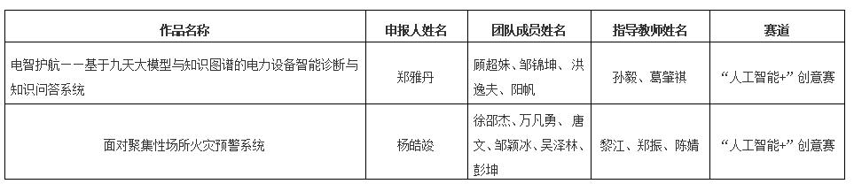 根据第十九届“挑战杯”全国大学生课外学术科技作品竞赛“人工智能 ”专项赛参赛组织工作安排,经团队申报、校团委形式审查,拟推荐《电智护航——基于九天大模型与知识图谱的电力设备智能诊断与知识问答系统》和《面对聚集性场所火灾预警系统》等2个作品参加第十九届“挑战杯”全国大学生课外学术科技作品竞赛“人工智能 ”专项赛,现将拟推荐参赛作品名单公示如下:
