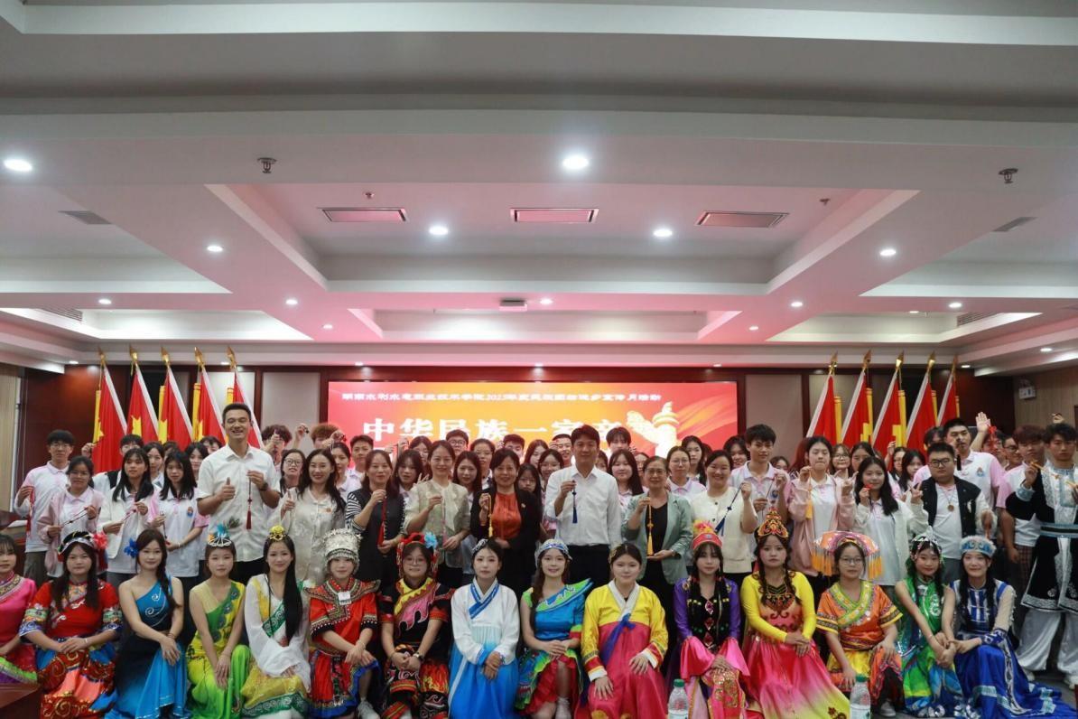 活动尾声,学院文娱部献歌舞《五十六个民族五十六朵花》,欢快旋律与优美舞姿尽显各民族风采。民族新生与老师上台,众人牵手互动,将现场气氛推向高潮。最后,全体师生手持亲手制作的中国结合影,定格下这一满含民族情谊的温馨时刻。