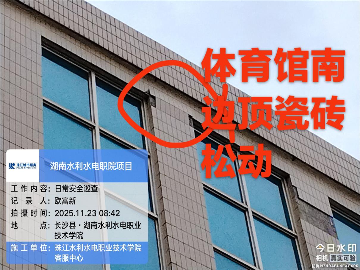 11月23日上午,珠江城市服务湖南水电职院客服中心物业安保团队在执行日常巡查任务时,凭借高度的责任心和细致的观察力,发现体育馆顶部存在瓷砖松动、存在坠落风险的安全隐患。为避免发生高空坠物事故,安保人员第一时间在隐患区域周边规范设置警戒线及醒目标识,并同步将情况迅速上报至物业客户服务中心。