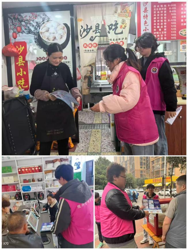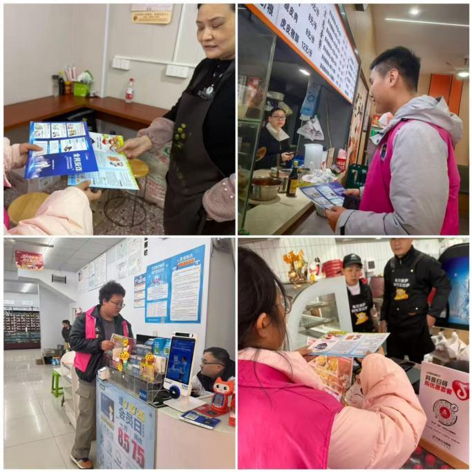 活动当天,由学生党员、入党积极分子与社区工作者共同组成的五支宣传小队,在经过简短动员培训后,分组前往预定街区。大家身着统一服装,走进超市、餐馆、文具店、药店等各类商铺,发放宣传材料,开展面对面讲解。