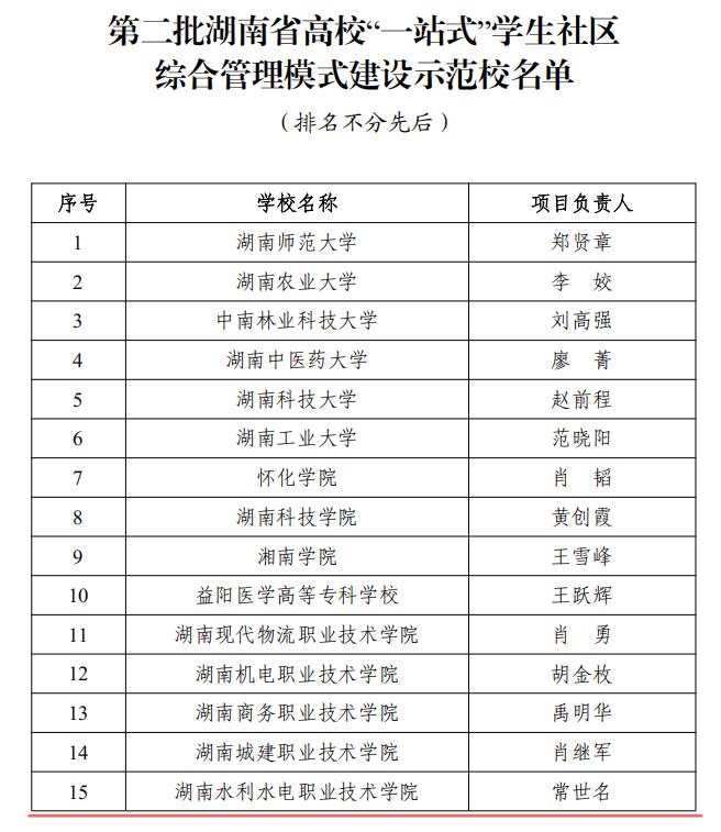 近日,湖南省委教育工委、湖南省教育厅公布第二批湖南省高校一站式学生社区综合管理模式建设示范校名单,我校成功入选建设示范校项目,这标志着学校立德树人工作取得重要阶段性成果。