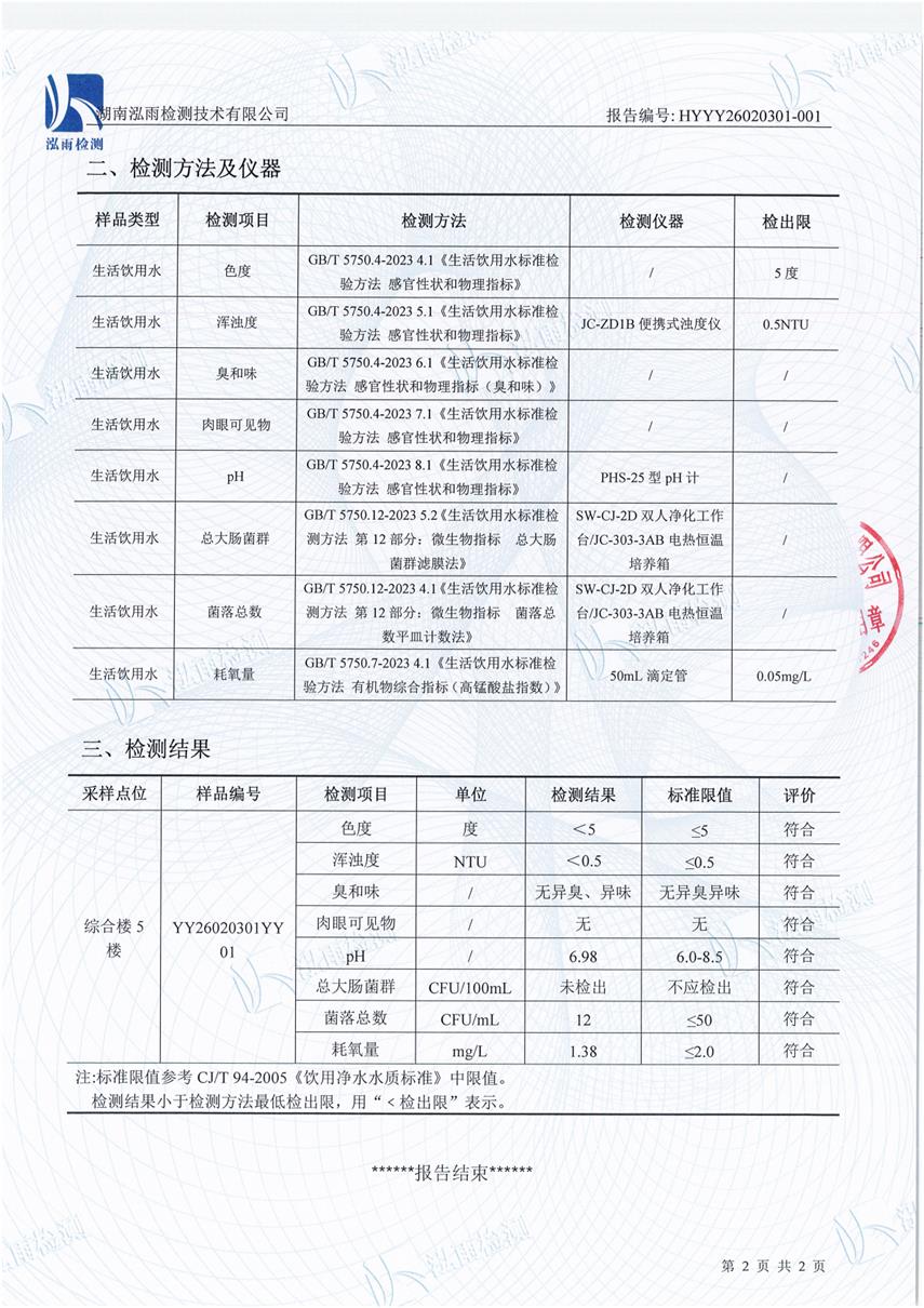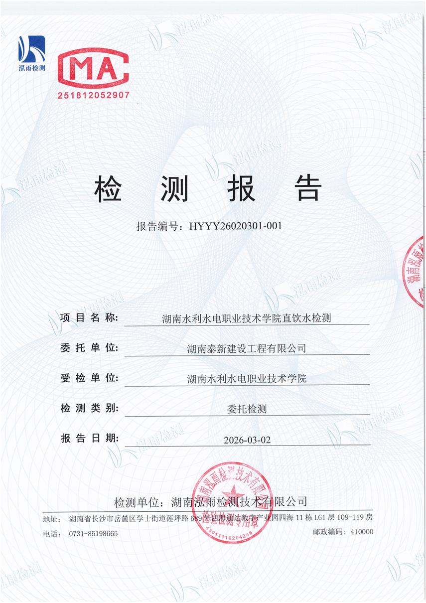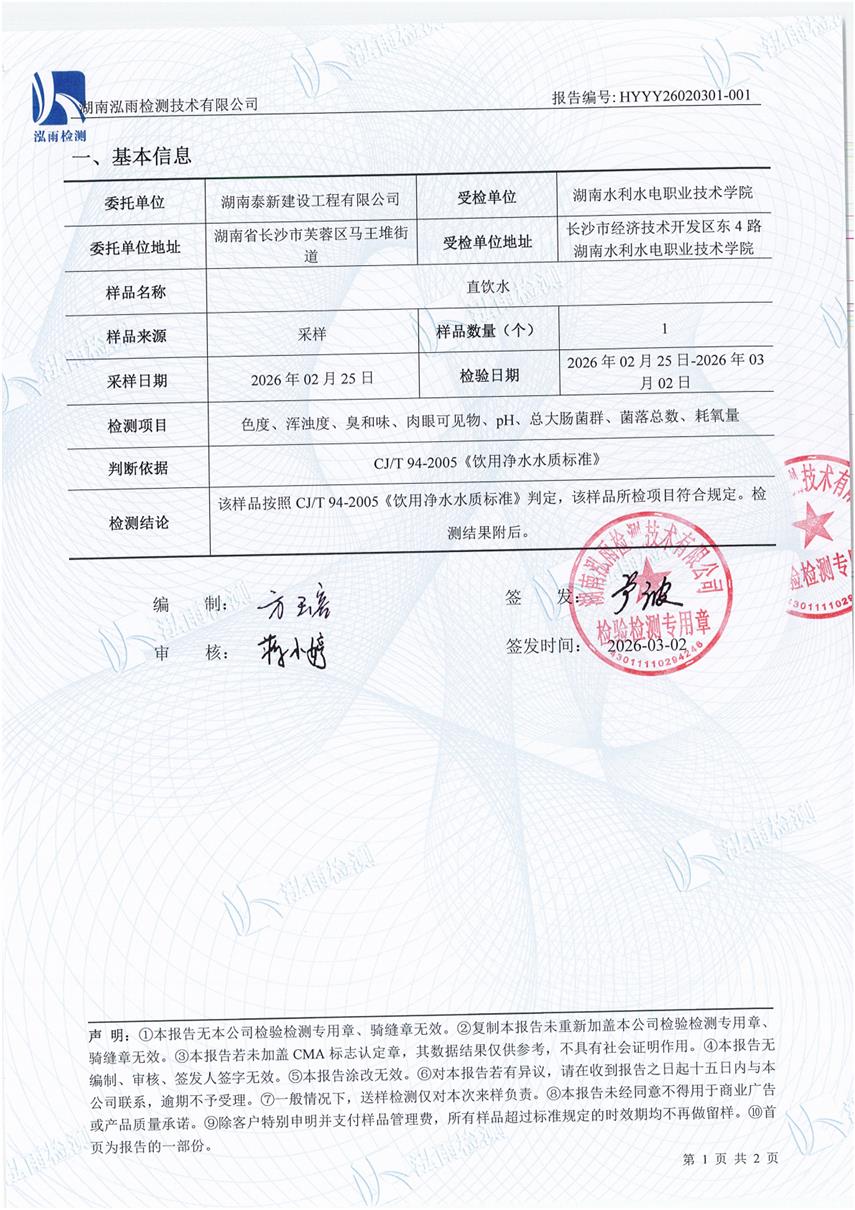我校直饮水企业在2026年3月2日委托湖南泓雨检测技术有限公司对学校直饮水开展了水质检测工作,现将检测报告予以公示: