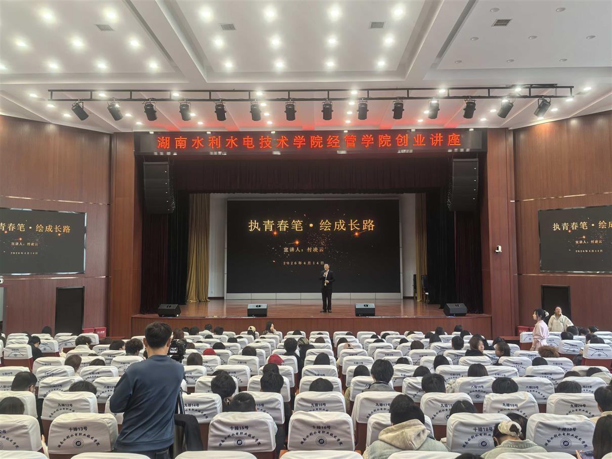 为深入推进创新创业教育,提升学生的创业意识与实战能力,4月14日下午,经济管理学院在礼堂举办“执青春笔 绘成长路”创业专题讲座。邵阳笃行影视文化传媒有限公司总经理付凌云应邀主讲,2024级、2025级网络营销与直播电商、跨境电子商务专业全体学生参加讲座。