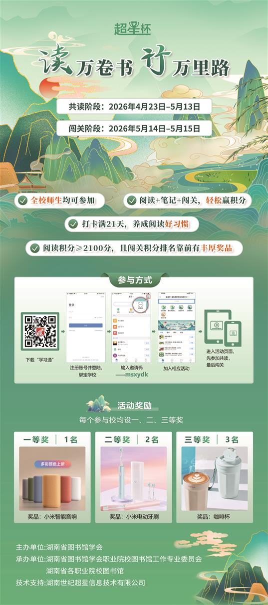 为深入贯彻党的二十大关于深化全民阅读的决策部署,落实《全民阅读促进条例》与湖南省教育厅“楚怡读书行动”工作要求,根据《湖南省图书馆学会关于举办"读万卷书 行万里路"全省职业院校师生共读活动的通知》要求,经研究决定,组织我校师生参加2026年全省职业院校阅读学习活动。现将有关事项通知如下: